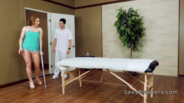 Redhead girl Skylar Snow gets physio massage for her injured leg then her masseur Xander Corvus shoves his titanic dick into her shaved piss hole while her oiled natural huge tits bumping