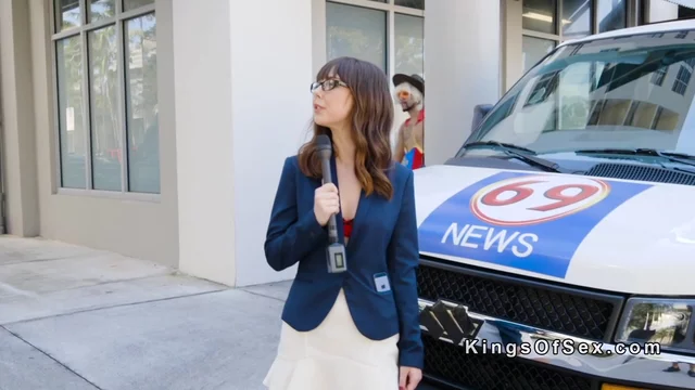 Sexy brunette newsgirl Ashlynn Taylor in eyeglasses interviews cosplay sexy wonedr lady Shae Celestine and then they finish in van where lick each other pussies