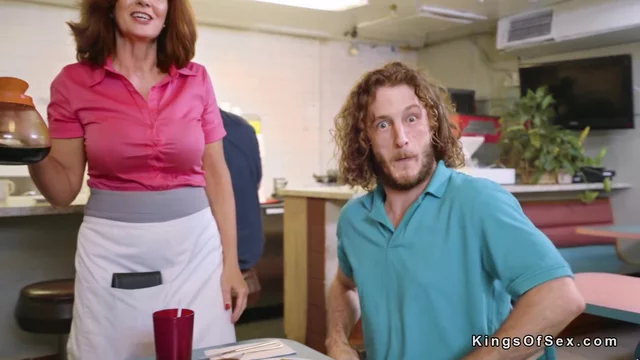 Dude Brick Danger with his buddy went for a dinner and then he plugged mature waitress Andy James before took off her panties and fucked her while large natural tits bouncing at local restaurant