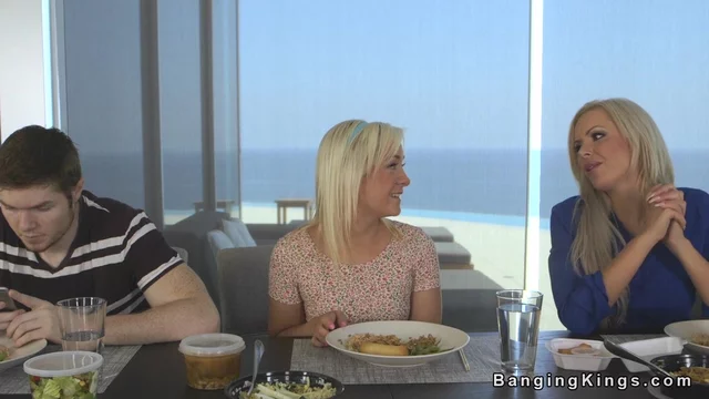 Boyfriend has over his teen soul mate Cleo Vixen at dinner with his mom Nina Elle but he is occupied with his phone and lesbian mommy brings teen on the sofa and licks her puss