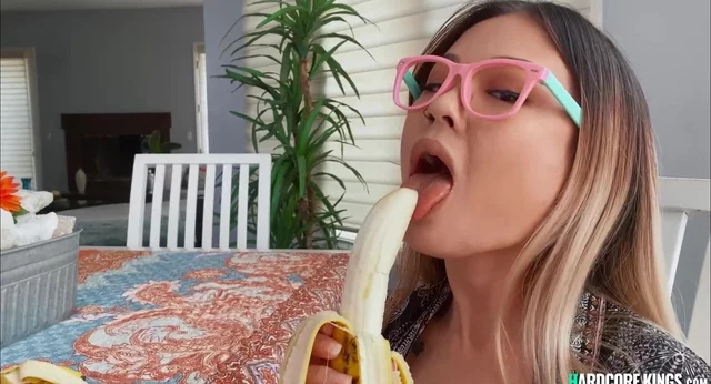 After breakfast sexy brunette petite Asian teen Lulu Chu sucking banana then stripping lingerie and sucking and fucking big cock POV to Charles Dera