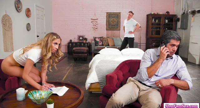 Skinny braceface stepdaughter opens the door bottomless.Her stepdad wants to give a cheque.When hes on the phone she decides to suck her neighbor and get fucked by him.The petite blonde doesnt mind her stepdad watching her get pussy licked and banged