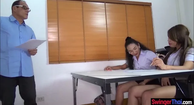 Thai student fucks her much older teacher in class in front of her friend In the middle of his explanation she interrupted him and went down on her knees to suck his big cock! Once it was hard she bent over for some doggystyle pussy pounding!