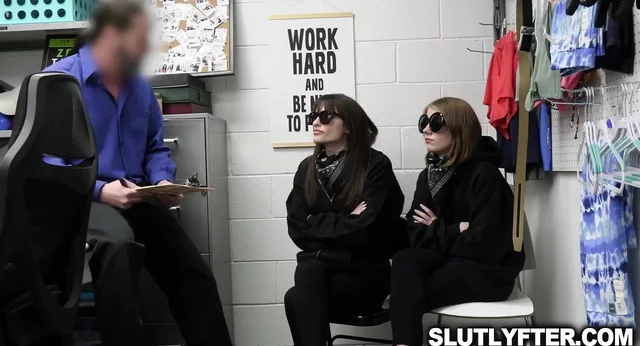 Officer Jack brings Dakota and Mia into the backroom, as he suspects them of being part of the ANTIFA rioters and accuses them of vandalizing his store. Officer Vegas says he has them on video and is very tempted to get the cops involved, unless they agree to let him have his way with them both