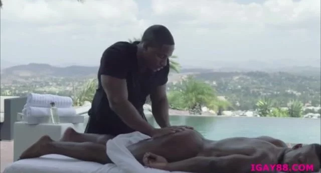 Hunk black studs DeAngelo Jackson and Liam Cyber headed outside where the other lays naked on the massage table as he oils her muscled body with sensual caresses. The two soon take turn sucking their big black cocks before their plump assholes are pounded.