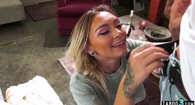 Skinny blonde teen stepsister Chloe Temple with small tits wants to move in her stepbrothers home so she grabs his big cock She gives him a sloppy blowjob and bro licking her shaved pussy then taboo fucking her hard from behind