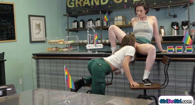 To attract customers a barista spreads and serves free puss alongside coffee.Soon all three clients have licked the baristas shaved snatch.The black licks the hottie while she eats her customer who gives oral while being facesitted by a tiny woman