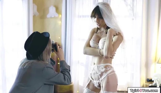 Trans bride Korra Del Rio positions in lingerie for her wedding photographer and gets turned on.They kiss and the slim lady blows the trannys large melons.The petite boobs tattooed lady deepthroats the brunet tgirls tiny dick and then the ladyboy screws her