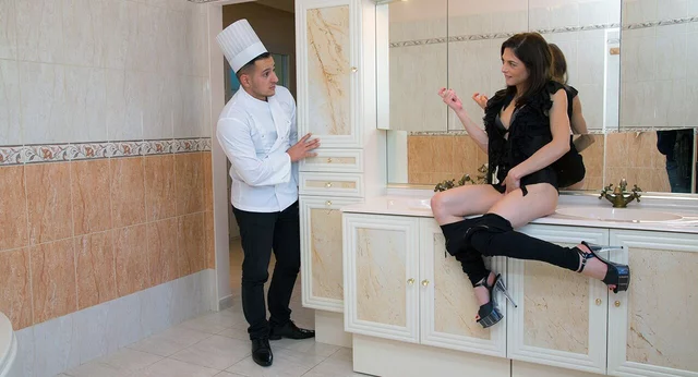 Even though Mr. Chef is doing his sexiest, the whole diner of the Hostel is completely empty! But this very enticing woman did not capture it as a immoral sign and proceeded to order some manmeat.