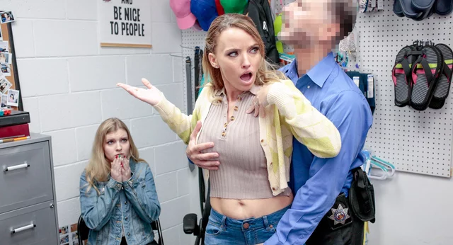 Pristine Edge and Harlow West took interrogated by loss prevention officer Calvin Hardy for allegedly missing a necklace. The two took submitted to a thorough striptease find and deep cavity find until they agree to a three way to avoid jail time.