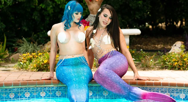 Asian tgirl mermaid Kasey Kei and big tits mermaid girlfriend Jewelz Blu get onto land.Intrigued that on has a dick and the other a piss hole they touch each other.The slim boobs ladyboy is deepthroated and licks the gigantic tits chicks shaved puss before screwing her