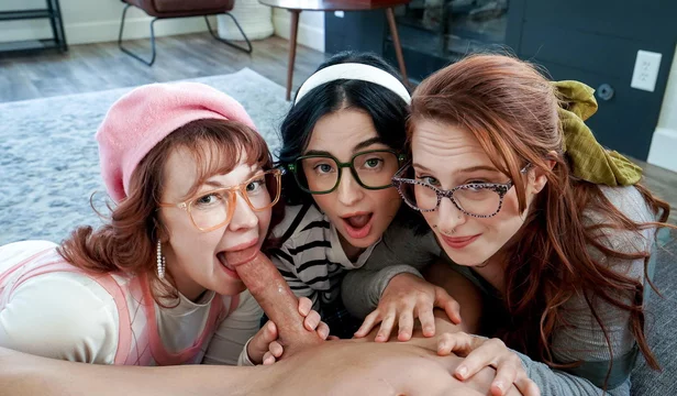 These nerdy girlfriends are sexting with everyone possible online, till one guy scenes up at their doorstep. Its time to invite him in for a four-some!