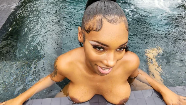 Mountainous boob ebony girlfriend close up seduces poolside on a sunny day