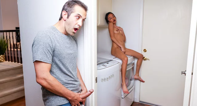Passionate skinny Asian Jade Kimiko uses the washing machine's vibration to fap, when Donnie walks in amazed by the arousing view that makes his stick rough. Jade saw him and started sucking his throbbing dick.
