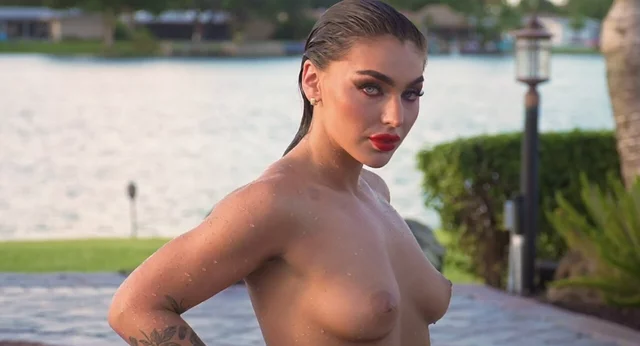 Glamorous inked brunet girl Emjay Rinaudo with marvelous melons is taking off her hot red bikini by the swimming pool outside The nude charm is posing to expose us her shaved vagina then she goes to the swimming pool to cool down her sexy body