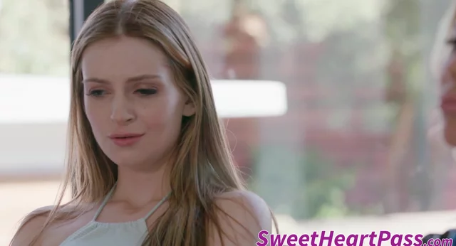 Alexis pushes Maya back onto the sofa and mounts her, fingering her pert breasts as she kisses her rough on the mouth.