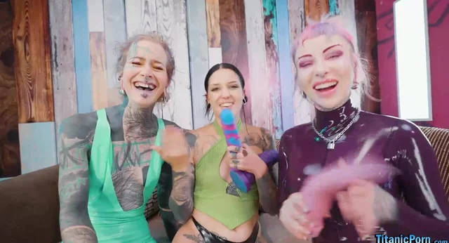 Radically tattooed women Anuskatzz and Kellie Panther join small sweetie Morea Ebony for a lesbo anal 3some. Wearing tight, revealing latex, Kellie and Anuskatzz playfully put Morea to job, spanking the chick's butt as they lewdly grope her body. They finger-screw Morea's piss hole and rim he