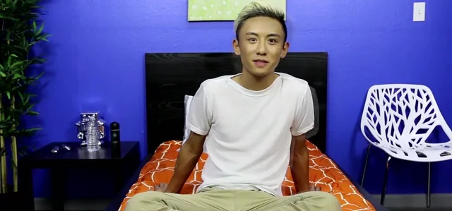 After Asian Twink's interview, he gets undressed and begins affectionately massaging his fantastic stick.