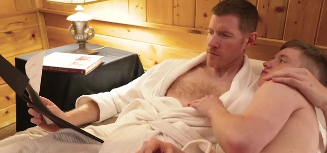nasty father giving his sweet skinny jockstrap stepson a lusty jerks off after a sensual dicksucking session, all while bareback fucking his titanic, rough penis.