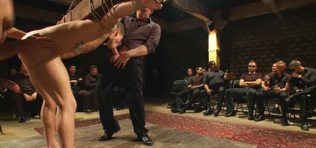 Dreadful guy bound and stripped nude in front a room full of passionate males! It's as if the devil himself sent an invite to this banged up sinister party! The crowd roars with excitement as our superhero Trent Diesel gets banged, flogged, spanked, used and !