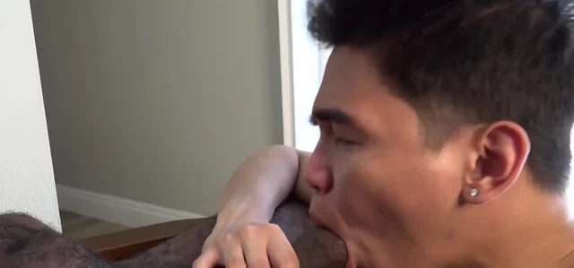 Sweety lustful Asian twink deepthroats great ebony dick after nipple play ending in colossal cumshot erruption.