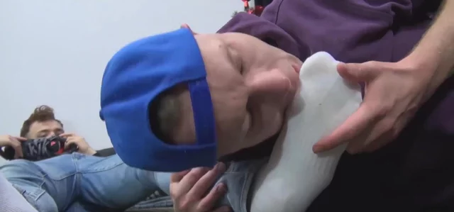 Short-haired twink gets his feet licked and cock sucked prior to getting his tight poop gap rammed while squeezed against the wall.