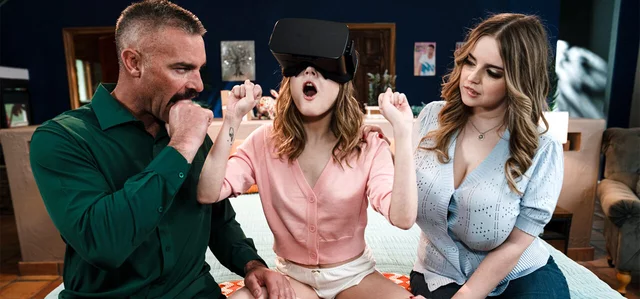 Little 18yo stepaughter teen Coco Lovelock took a VR headset from her stepparents Codi Vore and Charles Dera and then this happened when they walked in with her fapping Stepmother and stepfather took turned on by this and they played a game together!
