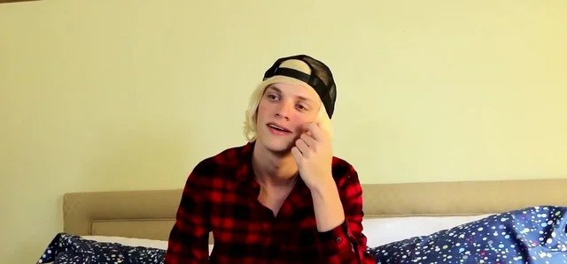 Long-haired fair dollface lays back on the bed after a meeting and starts pulling on his rod until it's overall quite wild for us.