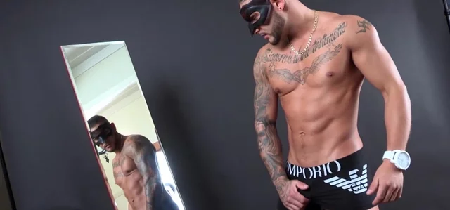 Masked stud actions off his hot muscular body and nice tatooes while jacking off his penis in a alone session.