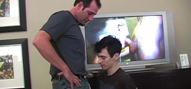 Tattooed twink gets on his knees for a qualified deep throat to his manly handyman making his penis rock rough while screaming from satisfaction.