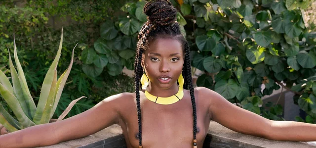 Hot black newcomer Dakota Simone with tiny boobs heads to Mexico for some sunshine with Playboy where the sexy ebony muse takes off her bikini and showing us her elastic body and her dark shaved vagina in the swimming pool