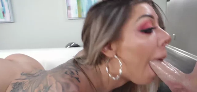 Large tits and heavily tattooed mature Karma RX needs face fucking before fountains of cumshot cover her face.