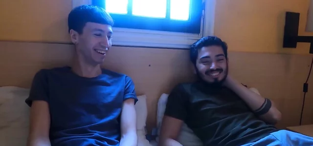 Horny travel buddies Cesar and Franco can’t hide their bulges—soon they’re sucking and stroking each other in the motel gym until they’re drained.