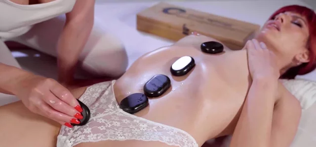 Large -boobed Czech Chick Gang gently places sexy stones down Yenifer Chaconâs back as she lies on the massage table before teasingly touching her thong clad ass.