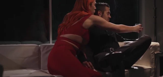 Foxy transsexual redhead gives extraordinary head to blooming stud before fucking and jizzing on him.