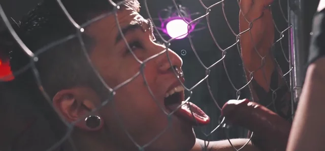Yoshi sits quietly on all fours in a warehouse anxiously awaiting his master. Yusaku strides in, poking his fingers through a chain link fence!