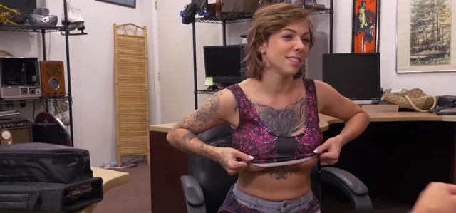Pleasing big boobs brunette striptease down for lustful pawnshop owner before he drills her horny kitty missionary.