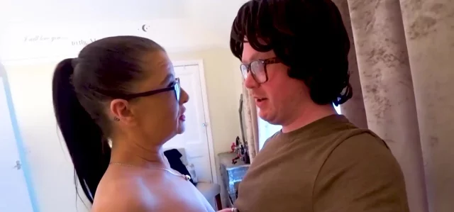 Glorious English cutie Auntie Lucy wears her sexy glasses and seductive stockings while sucking rock rough dick CLOSE UP.