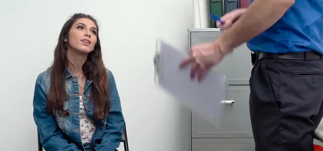 Teen brunette Gianna Gem caught stealing and to striptease by a security guard and to blow job his chrubby penis before doggystyle pounding and nasty facial.