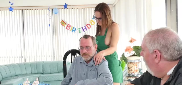 Lucky old man,not only is it his birthday so he's hanging out with his geezer friends, drinking and eating but they've also given him a teen to hump!