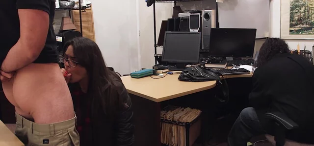 Chubby woman gets on her knees at a pawnshop for a CLOSE UP blowjob and some hardcore kitty ramming while her friend watch.