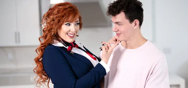 Flight attendant stepmom Lauren Phillips serves her needy stepson in this role play they did where he was the passenger on their imaginary flight! She got down on her knees to give him a bj before drilling his gigantic cock reverse cowgirl! What a service!