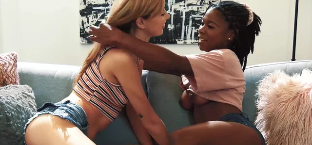 Ravishing ebony woman Hazel Grace seduces her blonde friend Haley Reed by eating her piss hole before putting strapon and banging her.
