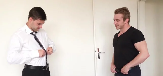 Real estate agent actions off his muscles in front of homosexual hunk customer who rides him with his beefiness and proceeds to bareback him!