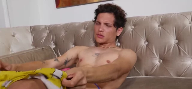 Twink Isaac teases his tight ass with fingers until he shoots a hot load all over.