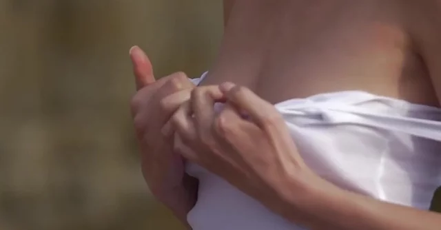 A provocative brunette wears a white tee, her perky nipples visible through it, before indulging in solo water play.