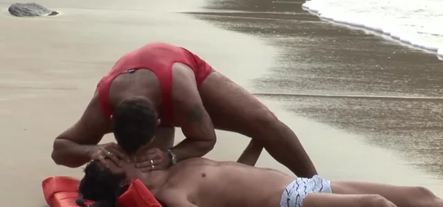 Lifeguard bangs cute jock after saving him nude on