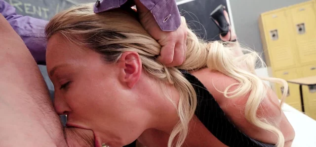 Stepmom Laura Bentley wants her stepson to graduate so she goes straight to his instructor and seduced him.The blonde milf offers blowjob in trade for his grades.The teacher takes the deal,licks her pussy before throat fucking her on the table.