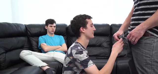 Gay forbidden threesome with two stepbros and their stepdad who also fucks them raw and challenging too.