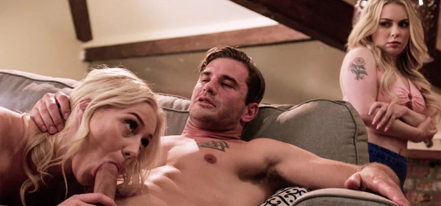 Jealous large ass stepsis Haley Spades tries to stop her petite teen bestie Skyler Storm from hooking up with her stepbro but when they start fucking in front of her she cant resist and joins in to get her tight pussy plowed with his large dick in a threesome